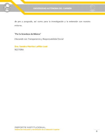 UNIVERSIDAD AUTÓNOMA DEL CARMEN de pre y posgrado, así como para la investigación y la extensión con nuestro entorno. “Por la Grandeza de México” Educando con Transparencia y Responsabilidad Social Dra. Sandra Martha Laffón Leal RECTORA 8
